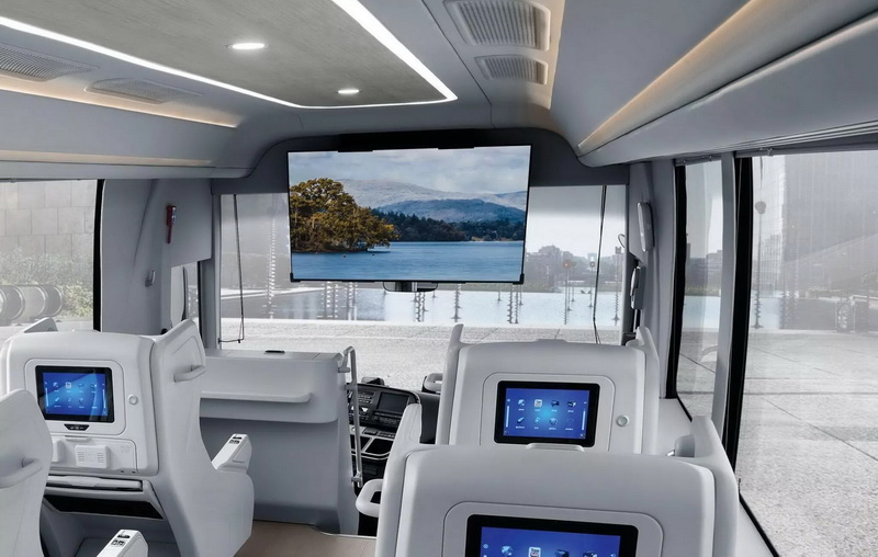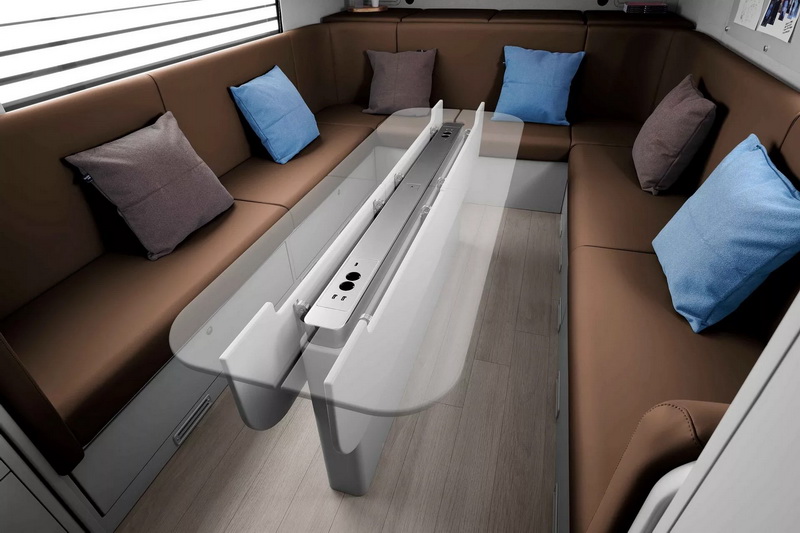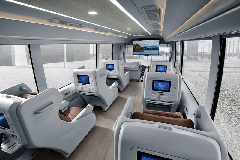 這款Universe Mobile Office在車艙內共分作三個區塊,最前方為傳統駕駛艙,中間區域則是個人工作位,每個座位皆配有豪華可躺式獨立桶椅、摺疊桌、電腦螢幕及無線充電板,一旁的車窗還具備有半自動遮陽簾功能,搭配上暖色系的木質地板呈現出舒適的環境氛圍,後半段則是獨立的小會議廳,中央配有摺疊桌及大尺寸電視螢幕,適合多人會議使用。