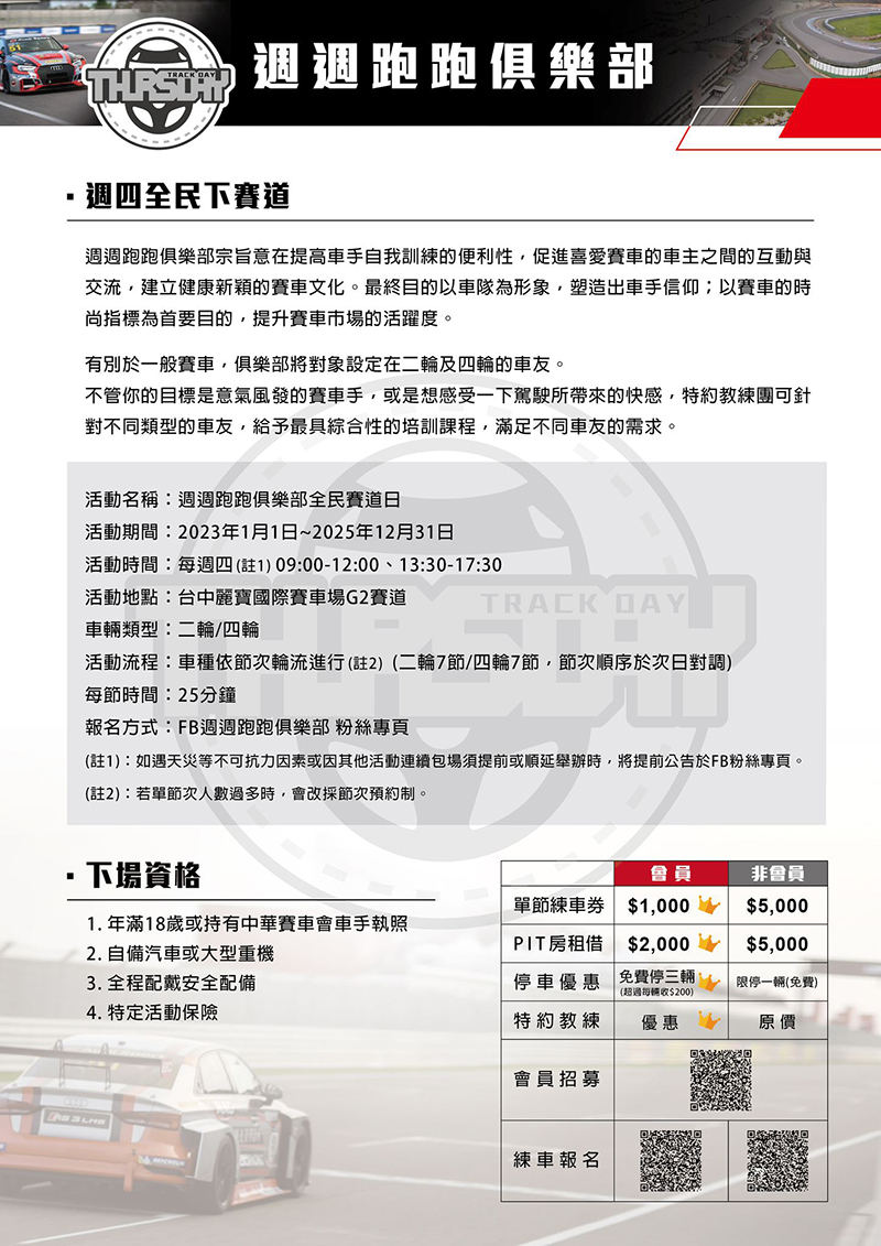 自龍潭賽車場走入歷史後,喜愛賽道駕馭的朋友,想要進到賽車場練車,不是苦無場地,就是進場收費高昂,難以負擔;而台灣車輛改裝品業極負盛名,且熱衷賽車運動的臺灣柏釧企業股份公司,除持續參與賽車運動外,也積極培育新生代車手,並且為了能讓更多人接觸賽車運動,特成立「週週跑跑俱樂部」,藉由與賽車場協議,固定包下每週四全天時段,用以舉辦「週週跑跑俱樂部全民賽道日」,將參與賽道駕馭活動的門檻降低,不僅讓愛車人可以用相對實惠費用進賽車場練車,同時「週週跑跑俱樂部」也具有由速邑國際賽車學校組成的特約教練群,提供參與賽道日的朋友進行諮詢與付費教學,進一步傳承賽車經驗與技巧,以利帶動整體賽車風氣。