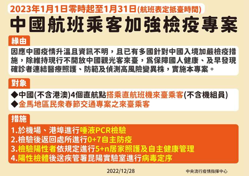 因應中國疫情升溫,台灣維持不開放中國觀光客來臺政策。此外,指揮中心宣布,自112年1月1日零時至1月31日(航班表定抵臺時間),搭乘自中國4個直航航線,及金馬地區民眾春節交通專案的來臺旅客,入境時須於機場或港口配合採集唾液檢體,進行PCR檢測。
