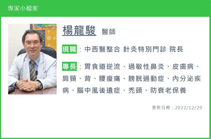 此外,楊龍駿醫師建議患者,初期一週針灸3次,待症狀逐漸改善,再遞減成一週2次。對於顏面神經麻痺症,目前雖然無確切預防方法,但仍可針對發生的誘因改善,例如:正常生活作息、良好睡眠習慣、適當的運動、飲食均衡,提高自身免疫力等,健康生活自然可以降低發生機會。
