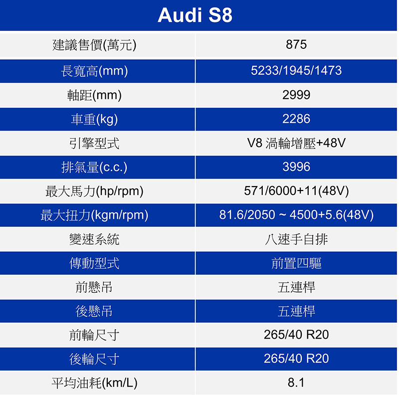 S8車身尺碼為5,233mmx1,945mmx1,473mm。