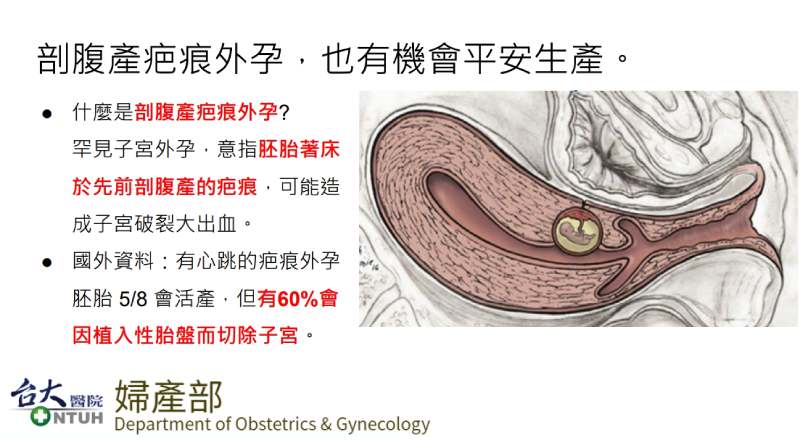 台大婦產部醫師戴怡芸指出,疤痕外孕容易造成子宮破裂合併植入性胎盤,併發產後大出血而需摘除子宮,根據國外資料,有60%會因植入性胎盤而切除子宮,若醫病共同決定繼續妊娠,後續需共同承擔風險。