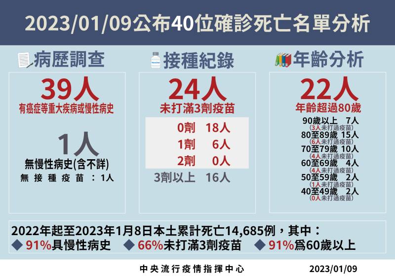 今日新增40例本土病例死亡個案,為24例男性、16例女性,年齡介於40歲至90多歲以上,皆屬重度感染、39例具慢性病史、24例未接種3劑以上COVID-19疫苗。