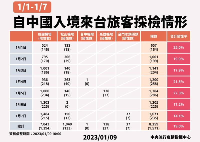 而1月1日起,中國入境來台旅客須進行唾液PCR採檢,王必勝表示,1月1日至7日,共採檢8259人,其中陽性有1571人,陽性率為19%,約有五分之一的旅客為確診者。