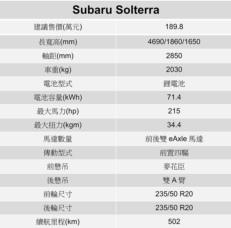 享受動力與操控就需付出代價,代價就是Solterra車重卻較bZ4X多出130公斤,因此在相同的71.4kWh電池模組下,經NEDC測試續航里程為502公里,較bZ4X的626公里少了許多。