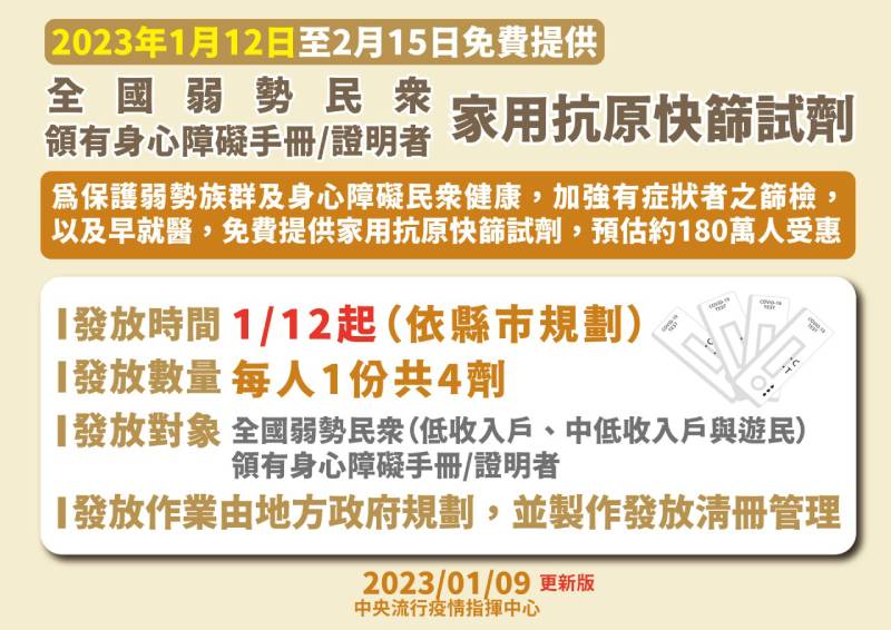 此外,針對近日疫情上升,指揮中心也宣布,1月12日起至2月15日前,將提供全國弱勢民眾(低收入戶、中低收入戶與遊民)及領有身心障礙手冊/證明者公費家用抗原快篩試劑。根據指揮中心監測資料顯示,本措施預估約有180萬人受惠。指揮中心發言人莊人祥表示,這部分將由地方政府規劃並製作發放清冊管理,發行時間從12日起,發放數量為每人一份(共4劑),這是為了保護弱勢族群、身心障礙者的健康,加強有症狀者的篩檢,同時呼籲民眾及早就醫。
