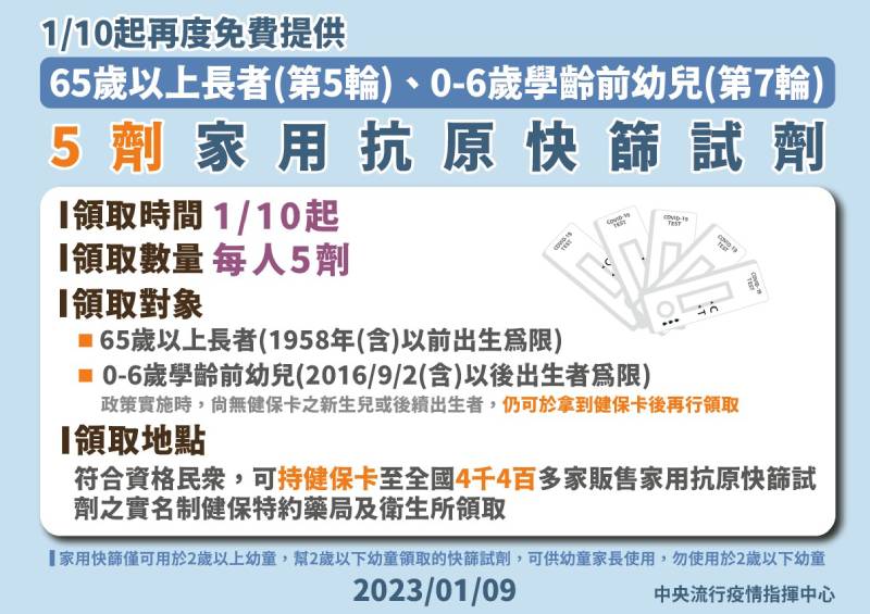 為因應民眾農曆春節假期家用抗原快篩試劑之需求,指揮中心宣布,自今(2023)年1月10日起至2月28日,實施第七輪0-6歲學齡前幼兒與第五輪65歲以上長者免費領取快篩試劑。