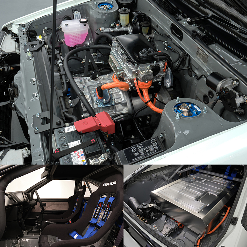 除了氫能源動力車,Toyota還展出了搭載純電動力的AE86,在維持AE86的輕量化車身結構,與維持前後配重平衡下,導入了與Lexus共同研發、且現已落實在市售車使用的電動化技術,包括使用了Tundra HEV的電動馬達與Prius PHEV的電池等,再搭配手排變速箱下,創造出更大的駕駛樂趣。