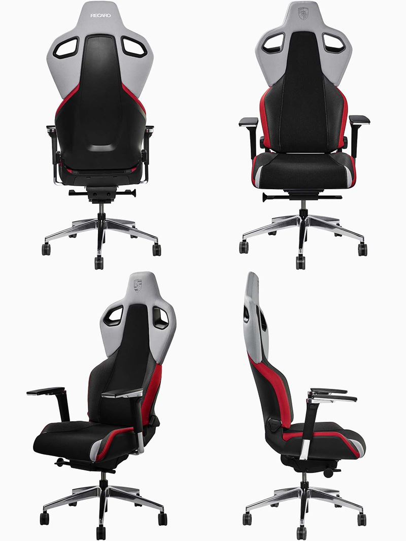 Recaro x Porsche 聯名電競椅,採符合人體工學設計,表面採透氣織布包覆,確保各種氣溫下的乘坐舒適度,防潛是坐墊與厚實地腰部支撐,提供輕鬆減壓地乘坐感,以鋁合金支架支撐地5D扶手,搭配座椅多向調整功能,讓每個人都可以迅速地調整至最適切的坐姿,並附有底座滑輪,方便四處位移,以輕合金製成的座椅骨架使其最大負載力達150kg。