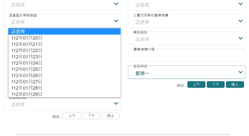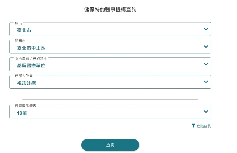 確診民眾若需視訊診療、想尋找附近有哪些診所開診,進入系統後選擇要查詢的地區,並選擇「基層醫療單位」、「視訊診療」,經由「進階查詢」中的「長假期時段」選擇欲看診的時間進行查詢,系統便會列出所有的開診診所。