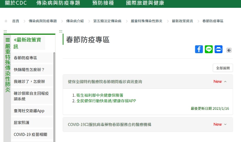 中央流行疫情指揮中心在疾管署官網設置「COVID-19春節防疫專區」,提供民眾查詢過年期間實體門診、視訊診療及藥物調劑服務情形。