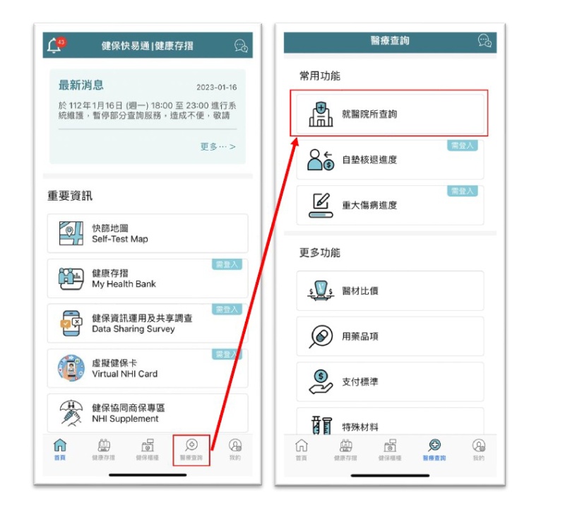 民眾也可以經由全民健保行動快易通/健康存摺APP進入「健保特約醫事機構查詢」系統。在APP內點選下方「醫療查詢」,經由「就醫院所查詢」就可進入健保特約醫事機構查詢系統。