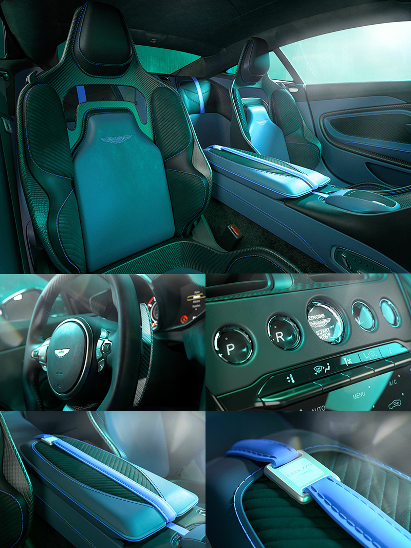 內裝部分,DBS 770 Ultimate 加入嶄新的設計元素,同時保留了DBS 辨識度極高的座艙風格。為了彰顯DBS 770 Ultimate旗艦定位,標配採用全真皮黑色皮革與Alcantara 麂皮點綴的Sports Plus跑車座椅,並輔以風琴式圖騰,碳纖維換檔撥片也在標準配備之列,座椅亦可選配更具運動性格的Aston Martin輕量化賽車桶椅,提供駕駛更優異地包覆性。DBS 770 Ultimate同時導入多樣化的客製化選配清單,例如同色或對比色的座椅皮革滾邊和縫線等等,而中央扶手蓋之皮帶飾條則鑲有雷射雕刻的DBS 770 Ultimate 專屬金屬扣環。而DBS 770 Ultimate 也配置了標準Aston Martin琺瑯飛翼廠徽、DBS 徽飾和限量的DBS 770 Ultimate車門門檻飾板銘牌。