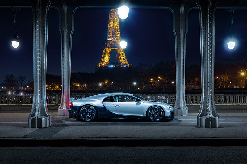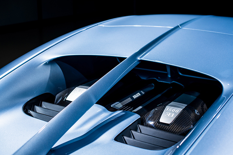 獨一無二的Chiron Profilée,採用了專為其開發的Argent Atlantique 原色,並在車身下緣直接顯露出炭纖維鈑件原來的紋路,並採用Bleu Royal Carbon塗裝,再搭配專屬樣式的輪圈,而車頭最具代表性的馬蹄狀水箱護罩則是以拋光鋁件呈現。
