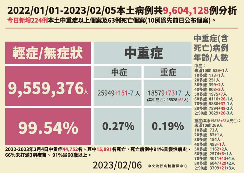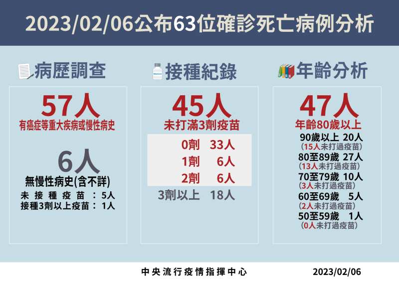 而今日新增63例本土病例死亡個案,為33例男性、30例女性,年齡介於50多歲至90多歲以上,皆屬重度感染、57例具慢性病史、45例未接種3劑以上COVID-19疫苗。