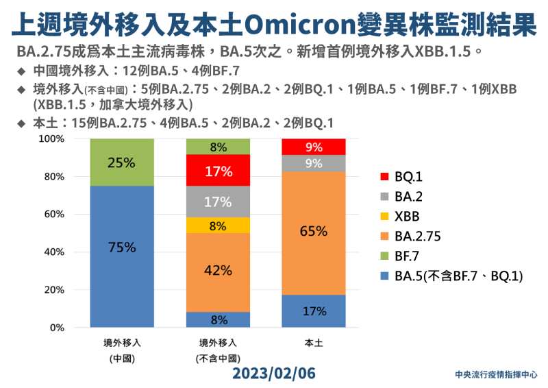 指揮中心說明,今日新增249例境外移入個案中,為113例男性、136例女性,年齡介於未滿5歲至80多歲。入境日期介於今年1月6日至2月5日。在上週境外移入及本土Omicron變異株監測結果中可看到,本土仍以BA.2.75為主流病毒株,不過,羅一鈞提到,BA.2.75主流優勢在持續擴大中,目前已由上週的53%增加到65%。