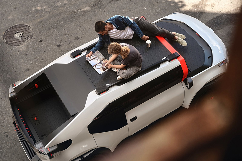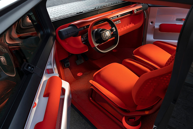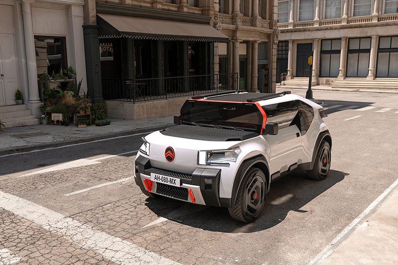 其接著指出,Citroën在2022年推出的Oli概念車就是一個很好的範例,Oli的開發目標重量僅1,000公斤,搭載電量40kWh的電池組,可創造400公里的續航力,同時大量使用回收材質,例如車頂、行李廂底板與引擎蓋是使用玻璃纖維面板之間的回收瓦楞紙板製成,該材質對環境的影響很小,進一步降低對環境的衝擊。另外,為實現輕量化,傳統音響系統將可用可拆卸的藍牙喇叭所取代,前座座椅所使用的零件,比同尺碼SUV的座椅少了80%,輪圈則是以鋼與鋁混搭製成,進一步減輕重量。