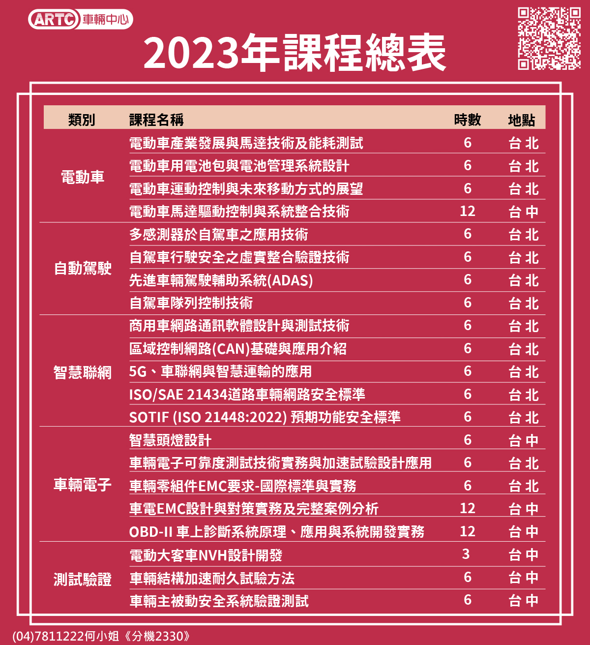 2023年車輛技術知識盛宴,您絕對不可錯過,歡迎有興趣者共襄盛舉,更多課程資訊請上網搜尋「車輛中心教育訓練」https://www.artc.org.tw/tw/service/training或洽何小姐 04-7811222分機2330了解更多課程訊息。