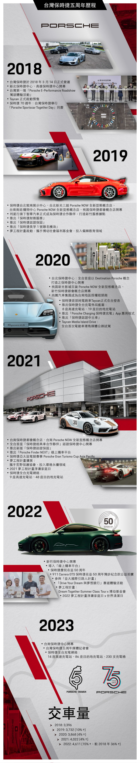 保時捷的成功源於其深厚的品牌歷史與內蘊。作為一個以夢想為動力的品牌,台灣保時捷相信,品牌內蘊將為保時捷持續開展創新和進步。繼 Taycan 在 2020 年取得成功之後,純電版 Macan 預計將於 2024 年開始交車,保時捷也在探索為中置引擎跑車 718開發純電版本的可能性,確保所有車迷都能持續擁有及享受充滿樂趣和腎上腺素的保時捷。隨著電氣化市場的發展,這些新車型將陸續加入保時捷當前的產品陣容中;2023 年,台灣保時捷除了致力持續為顧客及車迷們提供更卓越精進的保時捷體驗,也將舉辦慶祝保時捷跑車 75 週年和 911 誕生 60 週年的系列活動。