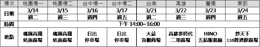 由HINO商用車、TOYOTA商旅車總代理和泰汽車主辦的「2023年商用車巡迴展」活動將於3/14(二)開跑,分別於桃園、台中、台南、高雄、宜蘭、花蓮共8場次巡迴展出各種最新車款,本次展示全新配備HINO六期安規系列車型、功能多樣化的各式完成車、TOYOTA商旅車及大型巴士,期許提供最全方位商品滿足顧客不同事業需求。