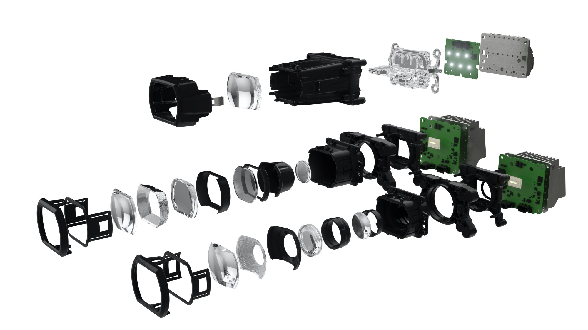 這組光學玻璃可產生不同的照射角度,HD 矩陣式車燈模組的廣角鏡涵蓋了前方寬 40度、高 10 度的照射範圍,內部的高性能長焦鏡片可產生寬 20 度、高 5 度的輻射式照射範圍,僅有廣角鏡一半的照射高度與寬度,但亮度比廣角鏡提升許多。透過將這兩組HD矩陣式車燈模組的光型重疊,可在車燈的中央區域產生更大範圍的照明與高亮度表現。