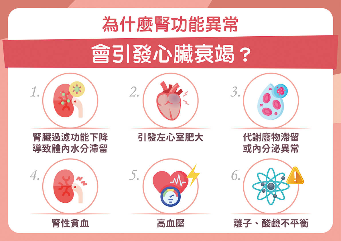 ・腎臟過濾功能下降,導致體內水分滯留,增加心臟負擔。