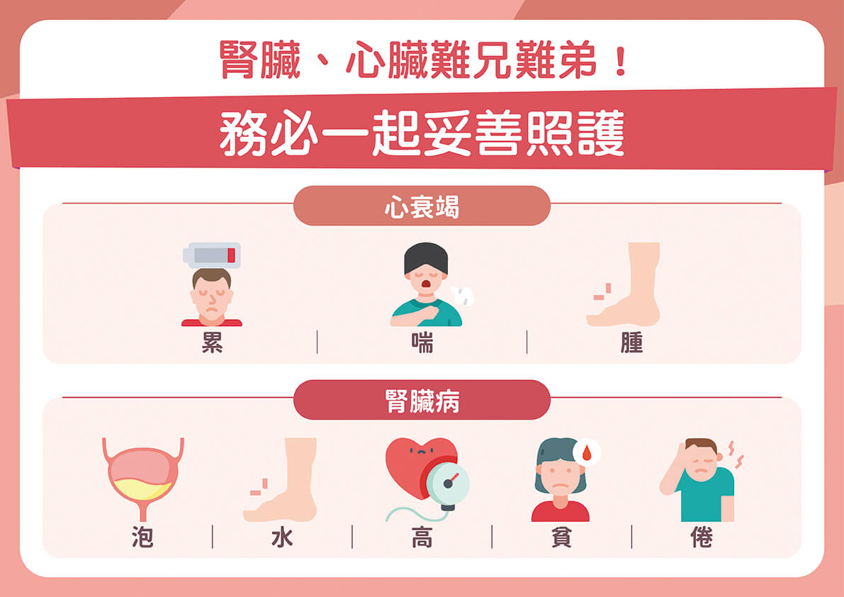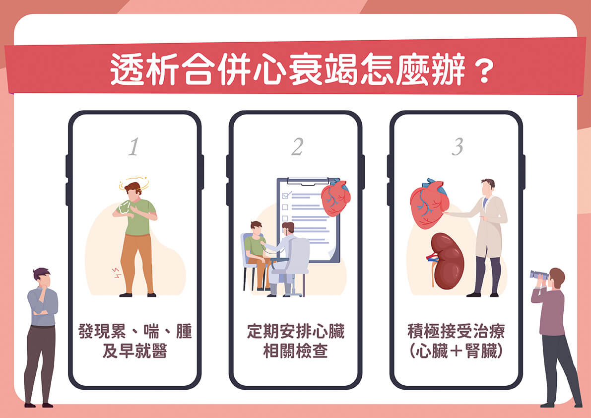 如果您是正在接受透析的患者,務必警覺累、喘、腫;即使沒有症狀,也要配合醫師定期檢查,早期發現、早期治療,穩定心臟功能,才能同時顧腎又護心,保持良好的生活品質!