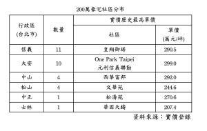 實價登錄上路以來,歷史紀錄最高成交單價是位在台北市大安區的「One Park Taipei元利信義聯勤」,最高成交價每坪299萬元,全台出現成交單價在200萬元以上的豪宅社區共有31個,這31個200萬豪宅俱樂部社區全都在台北市,並以信義區11個最多,第二名大安區有10個,中山區及松山區各有4個,中正區及士林區也各有1個。觀察近10年200萬俱樂部交易,在2017年成交量明顯增加,除了房市谷底反彈外,高單價豪宅的供給量提高也是關鍵。