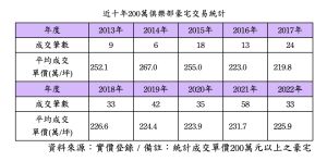 國內豪宅市場受限於政府積極打房及房地產景氣影響,量價都呈現趨緩跡象。根據實價登錄最新資料統計,2022年成交單價在200萬元以上的豪宅交易共33筆,跟前一年(2021年)的58筆相比,大幅減少43.1%,這些200萬俱樂部豪宅的平均成交單價也出現萎縮,去年平均每坪225.9萬元,比2021年下降2.5%。大家房屋企劃研究室總監郎美囡分析,豪宅一直都在不動產選擇性信用管制的行列中,2021年3月央行又再度下調豪宅貸款成數,但購置超級豪宅的買方以貸款做財務槓桿不多,故限制成數、無寬限期的方式抑制豪宅交易成效不彰,因此2021年創下200萬豪宅成交量新紀錄,直到去年央行減少資金水流、接連升息,內政部不時宣布打房政策消息,外在經濟環境也不樂觀,市場氣氛丕變,高價豪宅成交價量跟著緊縮。