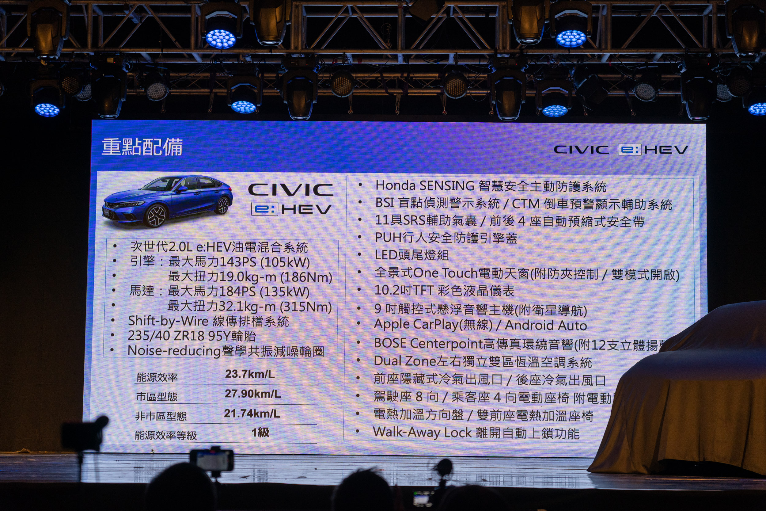 根據 Honda Taiwan 釋出的資訊,Civic 將以單一車型引進,最具話題性的動力部分,以 2.0 升直列四缸 Atkinson 循環式自然進氣引擎為基礎,搭配雙電動馬達構成 e:HEV 油電複合動力。引擎負責 143 PS / 19.0 kg-m 的峰值輸出,電動馬達則負責 184 PS / 32.1 kg-m 峰值輸出,不過,官方並沒有公布綜效輸出,而駕駛者也可以根據喜好來切換駕駛模式設定。能耗部分,市區可達 27.90 km / L,完全展現了 e:HEV 的優勢。