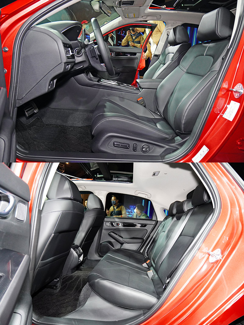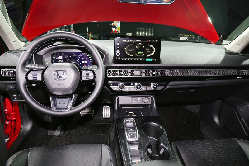 All-new Civic e:HEV延續以人為本「MM思想-人性空間最大化、機械空間最小化」設計理念,加長加寛乘坐空间與行李廂容積,締造極致舒適駕乘體驗。內裝以日製歐規高科技質感為訴求,蜂巢狀隱藏式冷氣出風口貫穿整個儀表控台,呼應外觀水箱護罩,另搭載10.2时數位液晶儀表板、9时觸控懸浮式主機、無線Apple Car Play配備;此外配有Walk-Away Auto Lock離開自動上鎖、跑車化設計上掀外滑式全景式天窗、駕駛座8向、乘客座4向電動座椅調整等舒適科技配備,成就頂級乘移動生活。