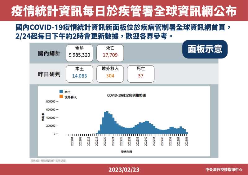 指揮中心宣布,每日疫情統計將改於疾管署全球資訊網公布,國內COVID-19疫情統計資訊新面板將會架設在首頁於2月24日下午2點開始啟用,未來每日下午約2點左右便會更新相關數據,提供民眾查詢。