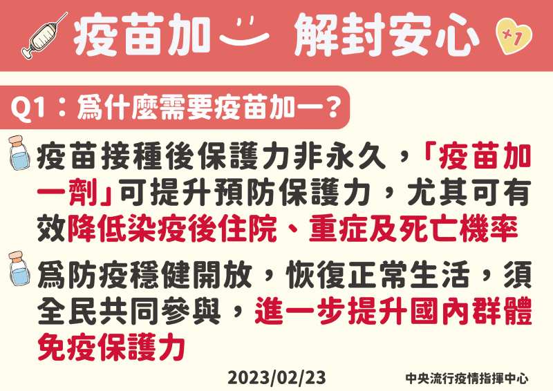 指揮官王必勝提到,「疫苗加一」的意思是希望民眾在2023年都能打一劑COVID-19疫苗。但為什麼要再打一劑疫苗?未來每年都要接種1次疫苗嗎?衛福部傳染病防治諮詢會預防接種組(ACIP)召集人李秉穎來解答。