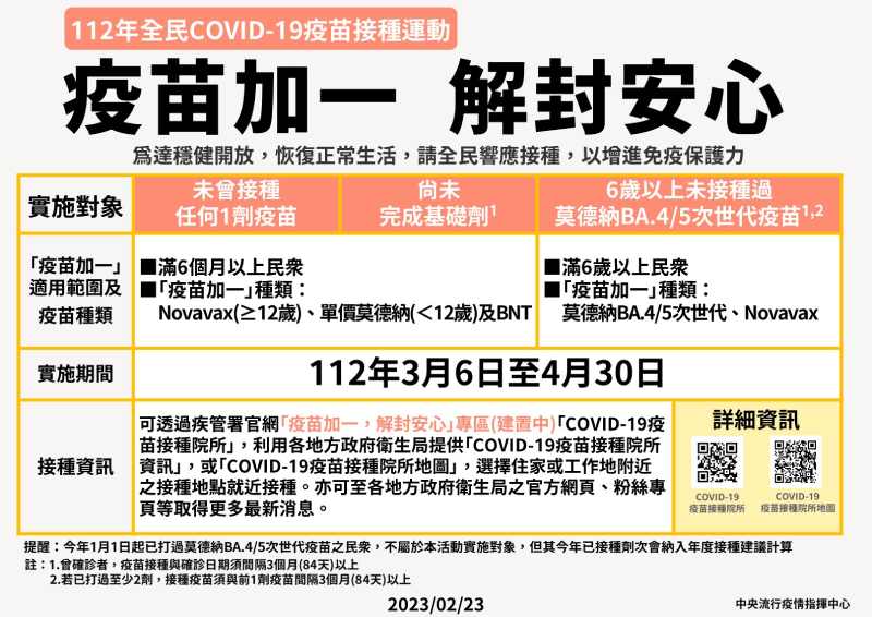 「112年全民COVID-19疫苗接種運動」實施時間為今(112)年3月6日至4月30日,活動主軸為「疫苗加一,解封安心」,呼籲「未曾接種任何一劑」、「尚未完成基礎劑」及「6歲以上於今年1月1日起未接種過莫德納BA.4/5次世代疫苗」的對象響應接種,以增進免疫保護力,做好開放準備。