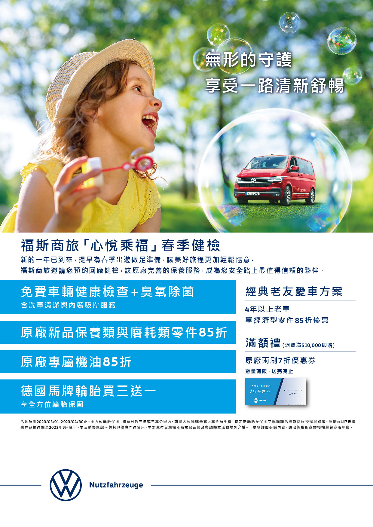 由於春季天氣多變化,福斯商旅「心悅乘福」春季健檢活動期間回廠消費滿$10,000元即贈送原廠雨刷7折優惠券(註2),讓每一位車主在雨霧季節都能享有清晰視線,保障行車安全。福斯商旅提醒車主,活動期間把握時間預約回廠,享受福斯商旅完整的健檢服務,讓福斯商旅伴您完成更多一趟趟安心的VanLife之旅。欲了解更多活動資訊,請洽全台各展間服務廠、福斯商旅官方粉絲團(https://www.facebook.com/VW.Bulli.Taiwan/) 或免付費服務專線:0800-889-699。