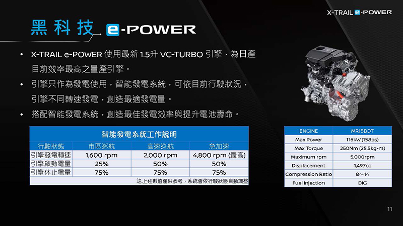 X-Trail e-Power所搭載e-Power動力系統,使以一具1.5升的VC-TURBO引擎作為發電機,搭配設置於前、後軸各一的電動馬達,其中引擎完全不驅動車輛,純粹作為發電用。