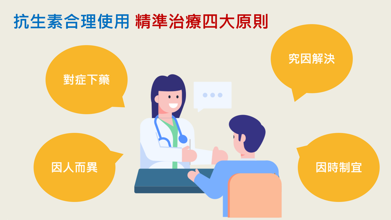 陳宜君進一步說明,抗微生物製劑的合理使用不是限制使用好的、新的藥物,而是強調精準治療的四大原則:對症下藥、就因解決、因人而異、因時制宜。第一對症下藥,針對感染症,要用抗微生物製劑。第二就因解決,根據疾病原因,而不是根據症狀,像新冠肺炎是病毒感染,就要選擇抗病毒藥物而不是對抗細菌的抗生素。第三則是因人而異,許多民眾新冠會自己痊癒。而需要治療時需根據病人的整體健康狀況、器官功能還有感染部位去選擇最適當的藥物。假如病人腎臟功能不好或者是有用一些藥物會有交互作用,有些好藥就可能不適合。第四是需因時制宜,再以新冠藥物治療舉例,抗病毒藥物希望在發病5天內使用,假如是發病5天後或者是已經變成重症的話,用藥重點就不一樣。