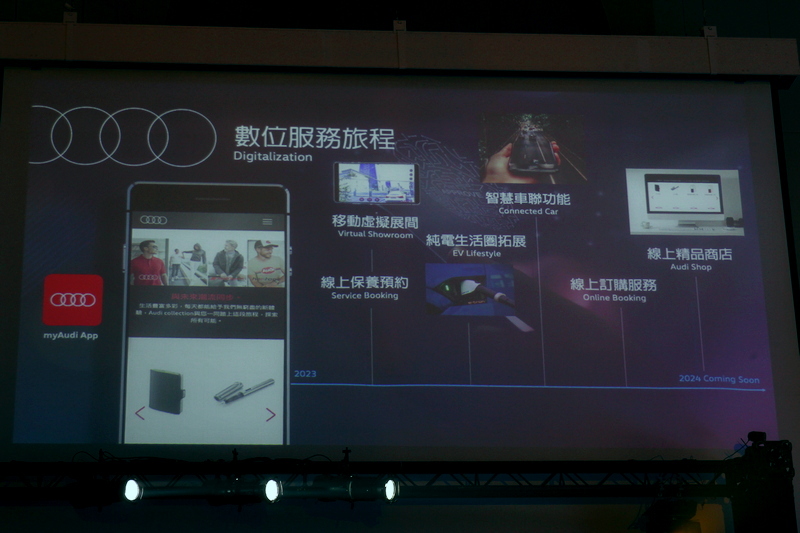 台灣奧迪近年於官網推出線上客製化功能及Line行動助理平台,讓車主與消費者可依自身喜好管道隨時隨地線上進行探索了解;近期亦升級優化MyAudi App數位服務,換上全新使用介面,逐步整合多項功能,讓Audi車主只需一機在手,即可完成「線上預約回廠」、「線上商店購物」等需求,更可以依自身喜好選擇付款方式及取件地點。此外,虛實整合的數位服務是提升顧客體驗的重要推動力,台灣奧迪將陸續同步於Audi 全台授權展示中心據點導入Augmented Reality擴增實境客製賞車功能,及Virtual Reality虛擬互動探索體驗,搭配銷售人員介紹,讓消費者能以多元管道探索Audi 車款。
