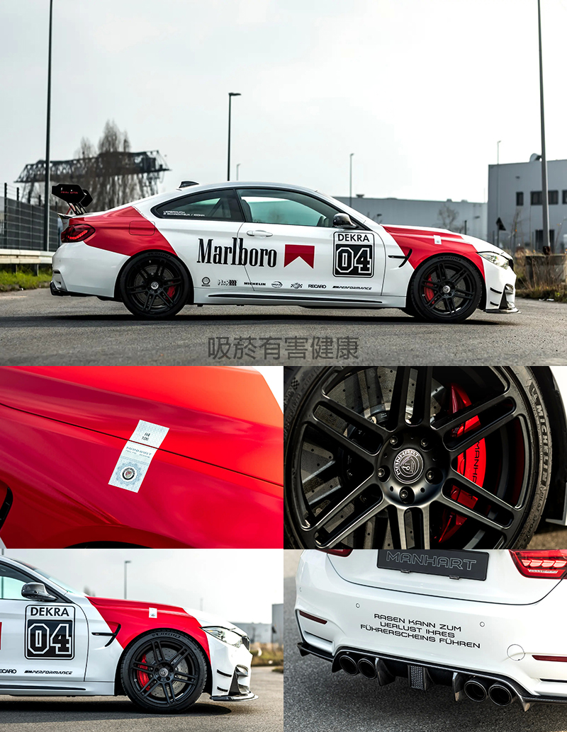 MH4 GTR就如同Manhart過去推出的改裝示範車,配上了全套的碳纖維空力套件,以及經典的Marlboro彩繪,胎圈組則是前9J×20、後10.5J×20之Concave One黑色輪圈搭配前255/35 ZR20、後295/30 ZR20米其林跑胎。