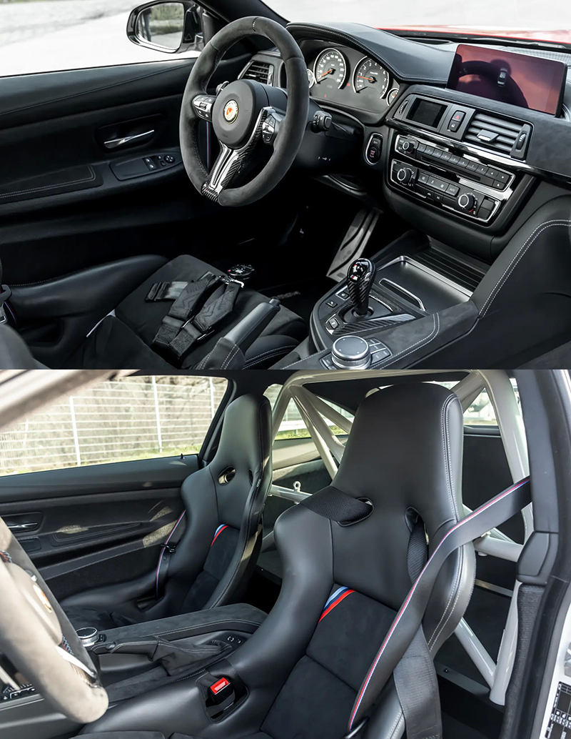 座艙中,M4 DTM Champion Edition已經標配了Recaro碳纖維筒型座椅、防滾龍與輕量化地碳纖維飾板,唯一新增的配備是取代一個中央空調出風口的Awron多功能顯示螢幕。
