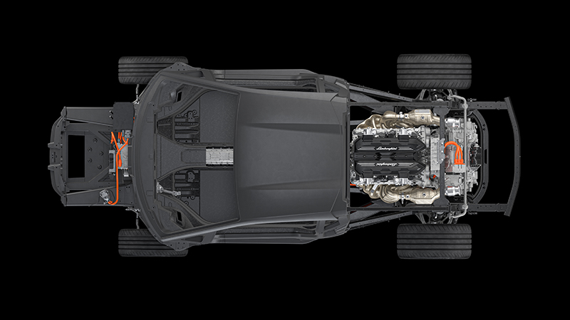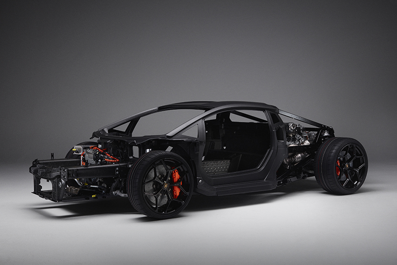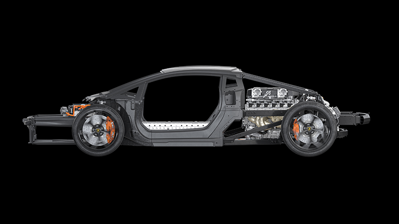 LB744的中段單體已經比Aventador輕了10%,前段結構也輕了20%,但整體抗扭曲力卻比Aventador提高了25%,達40,000 Nm/°,以確保最佳的動態性能。