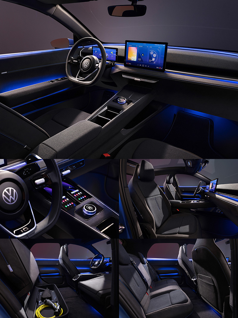 進入車內,同樣以清晰簡單的線條設計,中控台配置一大一小顯示螢幕,中央為整合了音量與空調控制鍵的多功能車載系統,前中央鞍座上保留換檔旋鈕,其餘周邊幾乎皆規劃為置物空間。而行李廂空間高達490–1,330升,已達到更高一階Golf等級的水準。