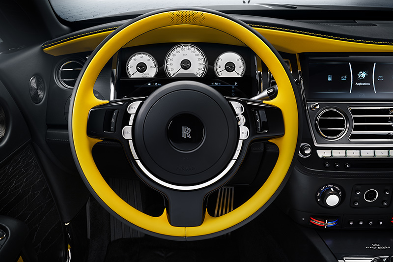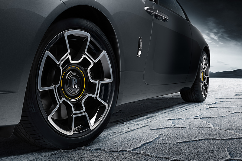 文前提到,Black Badge Wraith Black Arrow靈感來源Thunderbolt,在外觀的黑色箭頭中有著黃色圓圈,Black Badge Wraith Black Arrow也巧妙地將稱為Bright Yellow之黃色元素融入車中;首先在那深色鍍鉻水箱護罩後方,可以見到黃色的到V型水箱支架,這也是在Rolls-Royce史上首見的設計,另外在車頭兩側下方進氣口飾環與輪圈中央飾條也都採用相同的亮黃色烤漆;而另一個特別之處是在車頭歡慶女神立標的碳纖底座也有一圈黃色環飾。