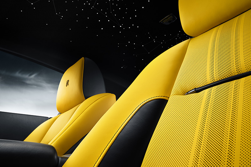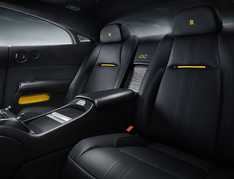 Black Badge Wraith Black Arrow不僅在許多細節上用上專屬設計,同時也在座艙中使用了專為其開發的新式材質,包括在中央扶手,中央鞍座、座椅角撐板、車門內緣與中控台下緣,都使用了“Club Leather”皮革包覆,展現更為深邃光亮的黑色,與呈現消光Rolls-Royce天然粒面黑色形成微妙地皮革對比感,同時在前座、方向盤、車門置物格內飾板使用亮黃色皮革包覆。並在前座頭枕外繡上了箭頭的意象徽飾。