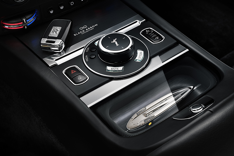 Black Badge Wraith Black Arrow的車門內飾板,有是一件驚人的藝品,使用襯開孔黑木為底,在鑲嵌上320多個多邊形雷射切割崁件,仿造出邦納維爾鹽灘開裂、不規則的表面,而此設計也應用在了後座中央後艙通道飾蓋上。