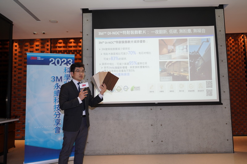 再以全球溫室氣體排放占比最高約38% 的建築與營建業領域為例,台灣政府目標2050年100%新建築物及超過85%既有建築物為淨零碳建築。若欲達到此目標,目前提倡以提升「再生能源」+「建築能效」+「家電能效」跨域整合的概念實行,且首先以公建築為表率帶動民間建築低碳轉型。因為隔熱可以節能,倘若在其基礎上,輔以3M建築隔熱膜科技,不僅能保有室內採光,還可有效降低建築物的碳排放量,每平方米窗膜可降低8公斤二氧化碳當量;若應用於辦公、酒店等玻璃帷幕建築,按統計資料,每平方米每年可節約空調能耗約129度,相當於減少65公斤的二氧化碳 。此外,還有一個重要觀念就是減廢可以減碳,應避免大幅度施工裝潢造成的碳排及資源浪費,而是採用對環境衝擊較低的建築材料及施工方式,例如3M™ DI-NOC™ 特耐裝飾軟片,即是一種更聰明的作法,和木工相比可減少70% 碳排、和石材相比可減少83%碳排,與原材相比可減少高達95%建築垃圾。