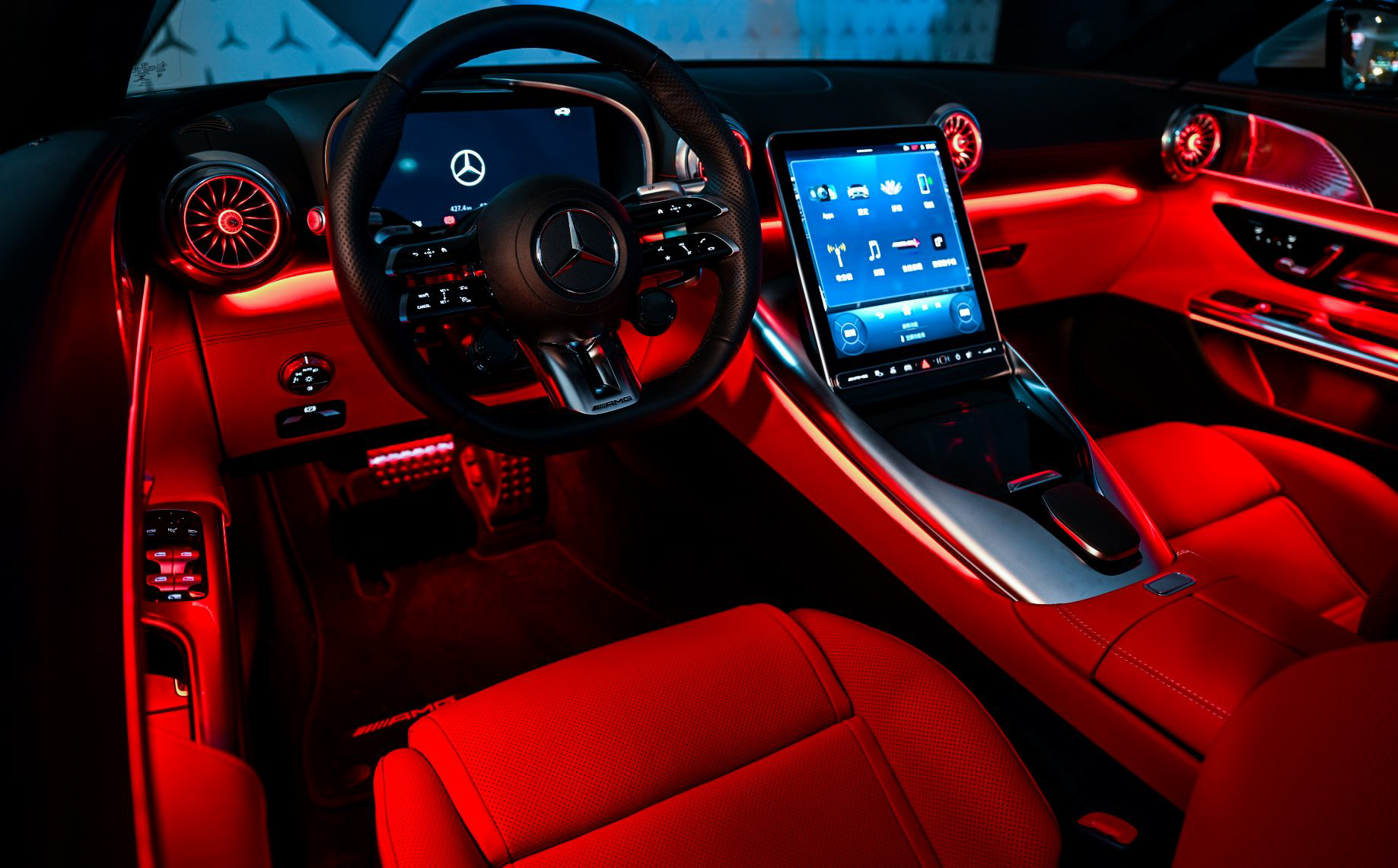 進入座艙,映入眼簾是以戰鬥機為設計概念的數位儀表,及 握感紮實的 AMG 平底化跑車方向盤。然而不只十足的戰鬥氣息,Mercedes-AMG SL 43 也可以很智能及舒適。11.9 吋高解析度觸控螢幕的中控台,內建 IWC 鐘錶顯示模式,盡顯優雅不凡氣息,另透過可調整角度( 12° ~ 32°) 得減少開篷時的反光,在不同環境下依然能從容使用;駕駛者可以在全新 MBUX 多媒體系統中完成各種移動中的需求,甚至只要說出「您好,賓士」 即可喚醒語音助理,為你調整車輛設定,以及使用具有 MBUX 擴增實境導航功能的導航系統指引你前往目的地,在前往的沿途過程,你可以自由駕馭著 SL 43 姿意暢行,亦或是開啟智能駕駛輔助系統,讓 DISTRONIC 智能定速測距輔助、智能轉向輔助為您減輕行駛疲勞,並在關鍵時保護用路人的安全。