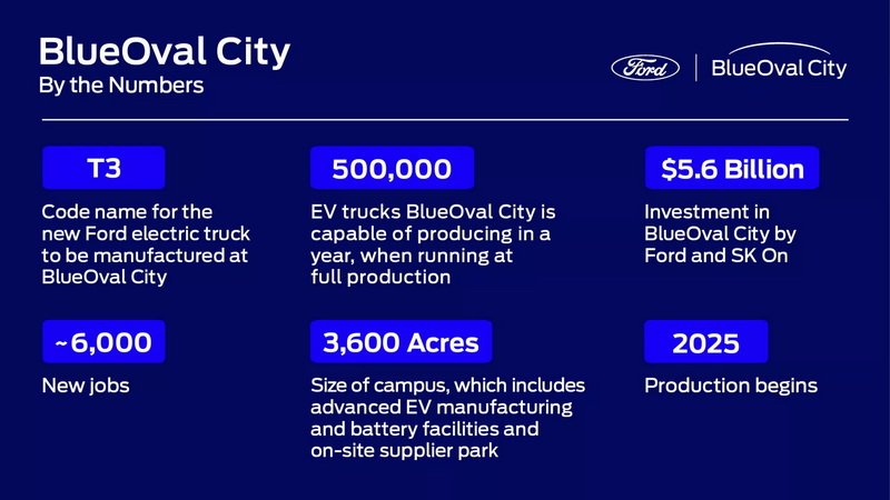 Ford在美國田納西州的BlueOval City組裝工廠是專為生產電動車所設計,該工廠佔地面積達3,600英畝,不過對比傳統生產線的基地面積卻能減少30%,一旦正式營運每年產能將可上看50萬部規模,同時也將在此生產電動車用電池,並且該工廠會使用綠色能源、地熱及廢水回收來降低對環境的衝擊,預計將招募6,000名員工。