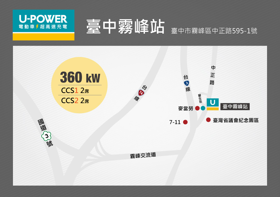 該站點座落於歷史人文氣息豐富的霧峰,緊鄰國道3號,同時也是台74線快速道路霧峰交流道、以及台3線兩大交通幹線匯聚點,可說是全國南來北往位居中部的重要據點。臺中霧峰站擁有360kW超高速充電功率,提供CCS1及CCS2兩種規格,並配置3支可支援超高速充電體驗的液冷槍 (500A),可完整實現原廠充電功率,讓電動車主們在U-POWER環台超高速充電網絡中輕鬆暢遊、毫無里程焦慮之憂。