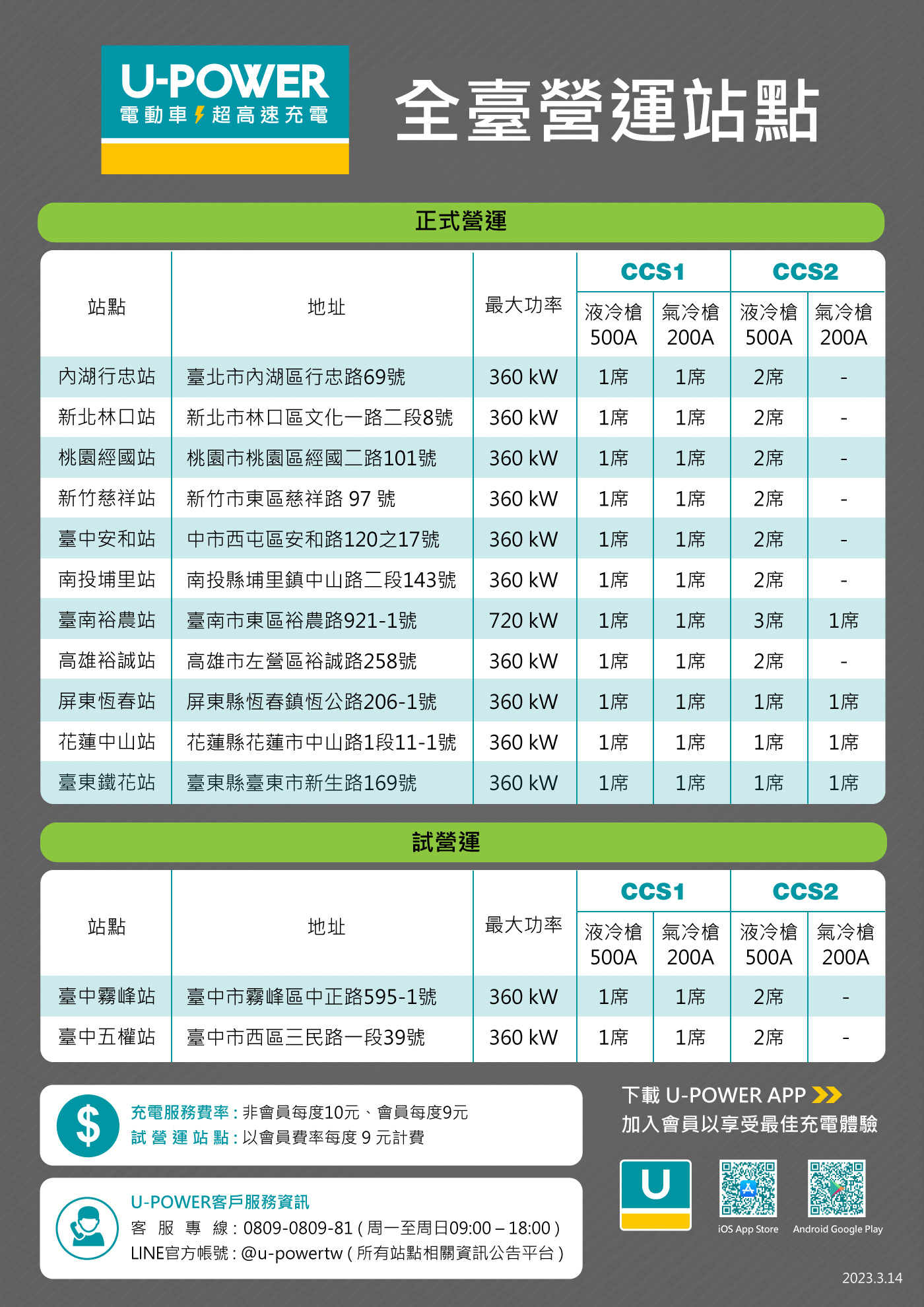 歡迎舊雨新知在臺中霧峰站試營運期間前來體驗U-POWER的高效率充電魅力與便利 ! 試營運期間均依正式價格進行收費,亦即會員以每度9元方式收費;而若以訪客方式使用充電服務,在正式營運後費用將調回每度10元。